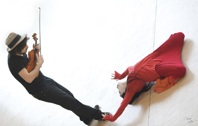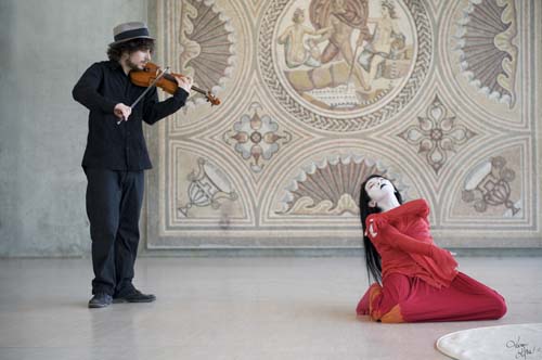 The birth of the creature: Dance begins. At times soft and subtle, or jerky, but constantly in interaction with the musician with whom the female dancer starts a game of seduction by being alternately affectionate or distant.
